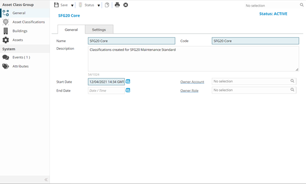 . Once the Asset Classification Group header has been completed and saved a sub navigation will appear to allow additional entities to be created / assigned.
