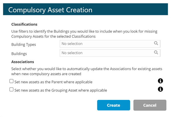 to instigate the creation of any missing Compulsory Assets. At least one compulsory Asset Classification must be selected from the grid before the button is clicked. Multiple selections are permitted. The button will open a window that allows you to apply additional filters and select some preferences for Asset Associations that are set when the compulsory Assets are created.