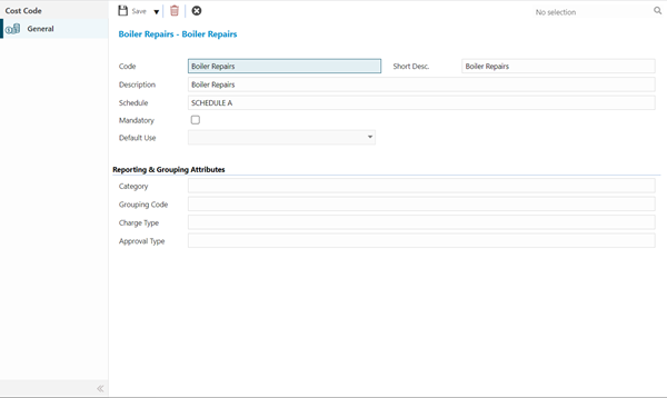 Cost Codes represent elements of Costs that can be associated with Cost Centres. A single Cost Code may constitute an element of Cost against more than one Cost Centre. For example, Cost Codes for reactive and planned maintenance may be used to monitor how much each Building or Department is spending on their upkeep.