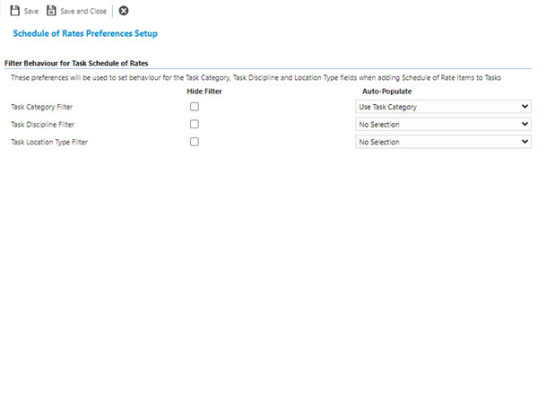 If the Hide Filter checkbox is checked, the Task Category field will be hidden in the Advanced Helpdesk > Schedule Of Rates sub nav > Schedule Of Rates input panel and the filter will not be applied.