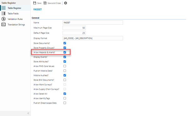 Hazard / Alert Types can be attached to many entities in MRI Evolution. To be able to store Hazard / Alert Types against an entity, the feature must be allowed in the Table Register.