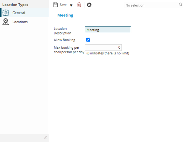 Adding a Location Type to a Location is what makes the room bookable. To aid with room booking and filtering different Location types can be added e.g. meeting room, training room or hot-desk.