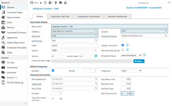 Instruction Sets can be used for anything from generic guidelines for performing Tasks to a very specific set of instructions to be followed during Planned Maintenance for PPM Tasks. Adding the number of Staff required to carry out a Task and the Estimated Time and Costs related to a Task, will provide more accurate information for planning of budgets and Staffing levels.