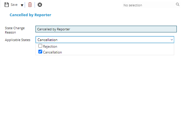 The state changes where the Reason will be presented to users can also be defined, enabling the creation of specific lists of Reasons for specific state changes.
