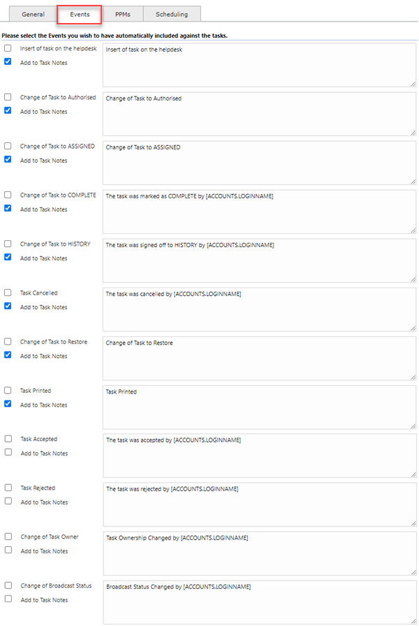 Note: It is imperative to use upper case text for [ACCOUNTS.FULLNAME] and [ACCOUNTS.LOGINNAME] in the Event text of the Events above, where required. These two are special cases since they do not relate directly to the entity that is being updated for the Event but the person that has carried out the action, which the Event is describing.