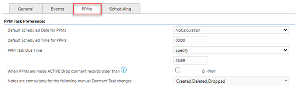 | Default Scheduled Date for PPMs | From the drop down select the Default Scheduled Date for a PPM - When a PPM is issued, MRI Evolution will auto-populate the scheduled date from the selected choice. This is essential if using the Resource Planner and pre assigning PPMs. | |