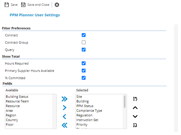 Assign the required field filters from the Available section to the Selected section. Only those fields assigned to the Selected section will be displayed in the PPM Planner.
