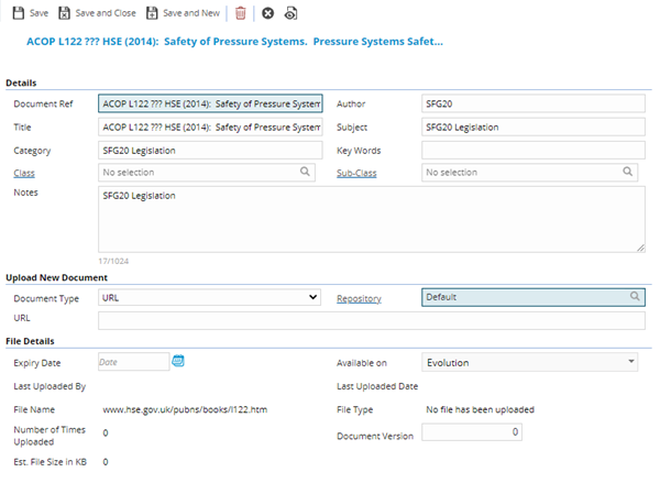 . A pop up window will appear which will allow the creation or amendment of a Document.