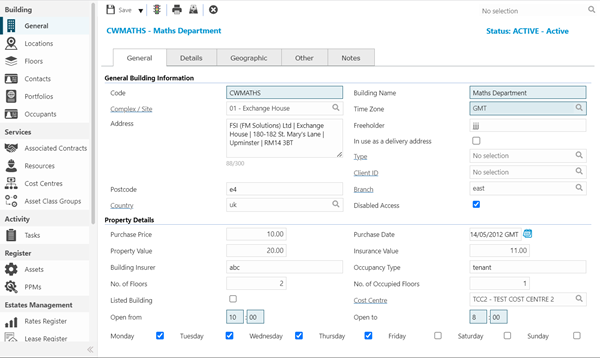 If using the Estates Management Module; Rent, Lease and Rates Registers can be linked to a Building. Building Utilities can also be recorded.