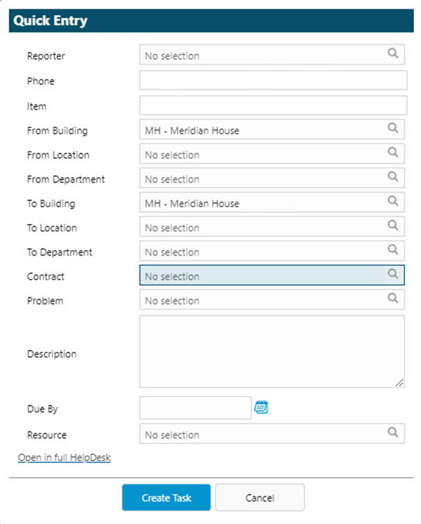 Quick Entry toolbar button to open the Quick Entry Helpdesk. The current Building will be passed to the Quick Entry Helpdesk, populating the Building field or From and To Building fields, if using the Integrated Services Module, automatically, as can be seen below: