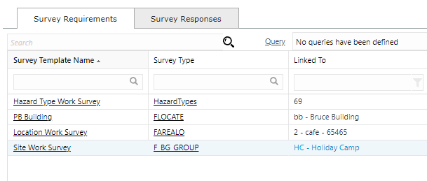 The Survey Requirements tab contains a grid of Task Requirements that are Work Surveys related to the current Task. These may have been created automatically when the Task was created or added manually via the Add/Remove Requirement toolbar button