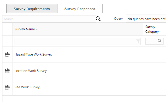The Survey Responses tab contains a grid of completed Work Surveys related to the current Task. These may have been created in MRI Evolution via the New Response toolbar button or in a Evolution Go activity.