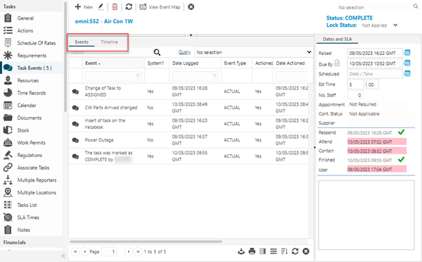 The Events tab contains the grid of Task Events related to the current Task. It is a grid view which can be searched, sorted and customised as normal.