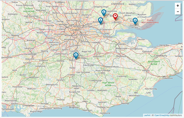 Select one or more Task Event records in the grid and click the View Event Map toolbar button to open a pop up window that displays 'pins' that equate to the Latitude and Longitude GPS co-ordinates of the Evolution Go Resources, assigned to the current Task, at the point that they carry out actions in the activity, these are recorded as Task Events or Time Record Events.