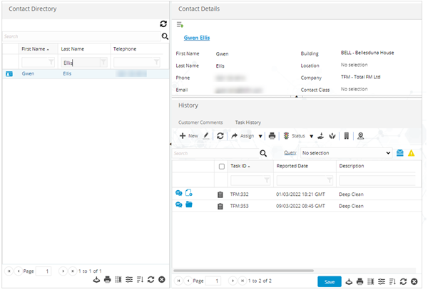 - Task History - grid of Tasks where the currently selected Contact is the main reporter or one of the multiple reporters of the Task, regardless of the Building or Location of the Tasks
