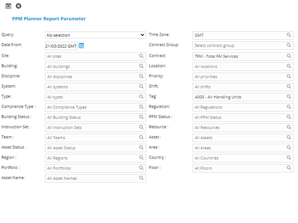 The link will open the PPM Planner Report parameter window which will allow the creation of the PPM Planner Report.