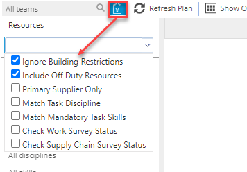 When this option is toggled ON it has the effect of ignoring one of the system's baseline filters, the filter that says the Resource must be assigned to work in the Building of the current Task. When this option is toggled OFF, only those Resources assigned to work in the Building of the current Task will be displayed. Note: This filter option is subject to user's granted Permission. |