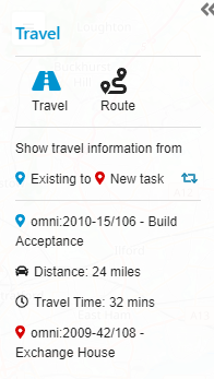 When the Travel and Route Information pane is expanded and the Travel option is selected the travel information will be updated automatically on any change to either the Task selected in the Task grid or the selected Time Record (day view or map pin)
