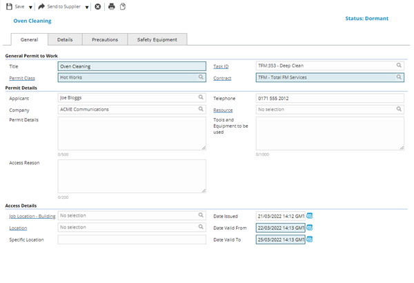 Available from 5.3.0.0 Click to send a Work Permit to a Supplier - Available for use with Contractor Gateway. |