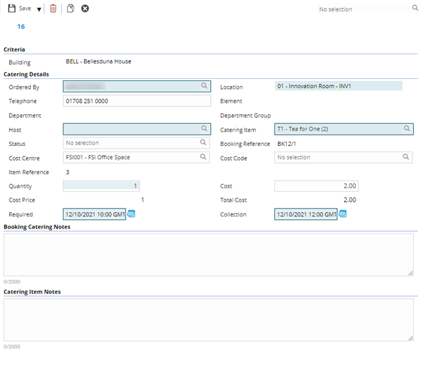 The Catering Management grid shows all Catering that has been ordered. This allows a clear view of all Catering requirements past and present.