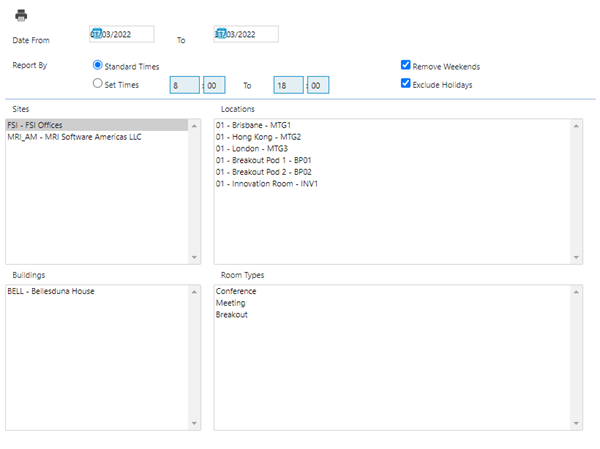 Enter the required dates, times, Sites, Buildings, Locations and Room Types. Click Run Report