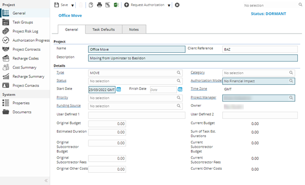 Projects are time managed using Tasks. Project Tasks are organised in Task Groups