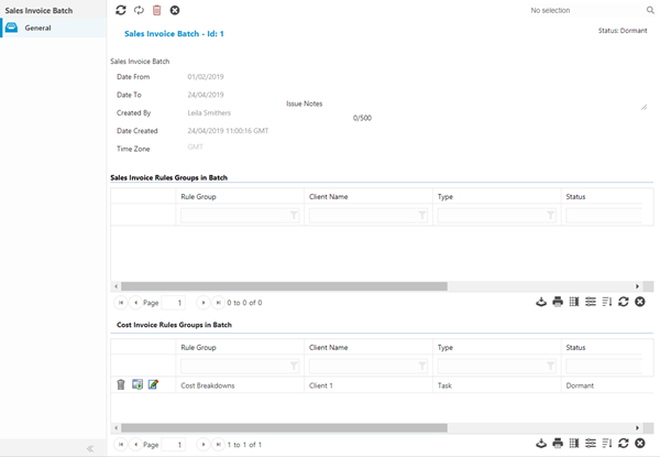 Edit Batch | Clicking will open the batch and allow the view and edit of all generated invoices - any Tasks that have been invoiced in the batch can also be viewed from the sub navigation Tasks in Batch. |