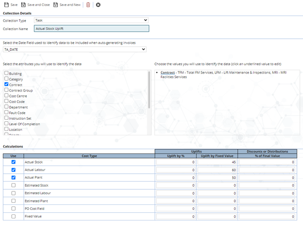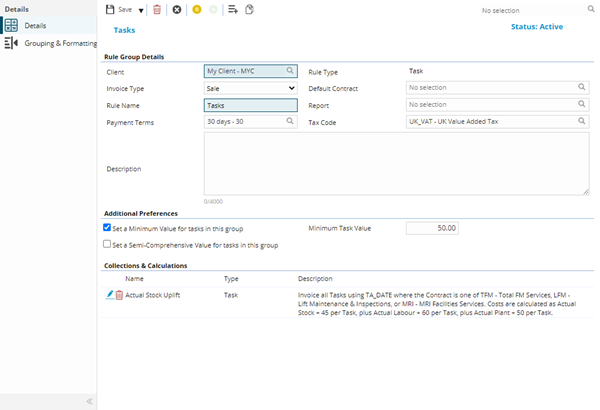 Collection Details define which date fields and which attributes and values must be met for a Task to be invoiced or WIP costs to be generated. The calculations define which Uplifts (mark-up) and discounts if any, will be applied. A Rule Group can have any number of Collections associated with it.