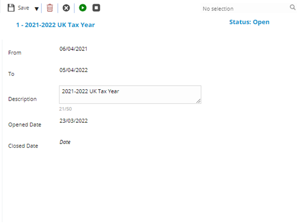 An Accounting Period must be open to allow creation of an invoice. Accounting periods are opened and closed manually. The system will produce a prompt if an attempt is made to try to close an Accounting period when there are invoices still outstanding. An outstanding invoice is an invoice that has been raised within an accounting period but has not been completed. It will be possible to close this invoice in another Accounting Period; however it will reflect a different Tax Point to the Accounting period it was raised in.