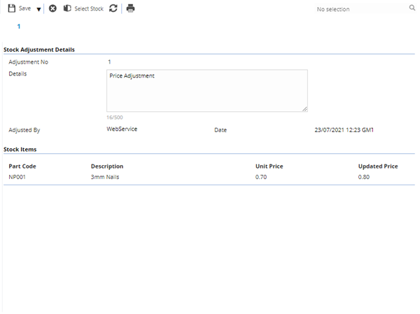. A pop up window will appear which will allow the creation or amendment of a Stock Adjustment - Price.