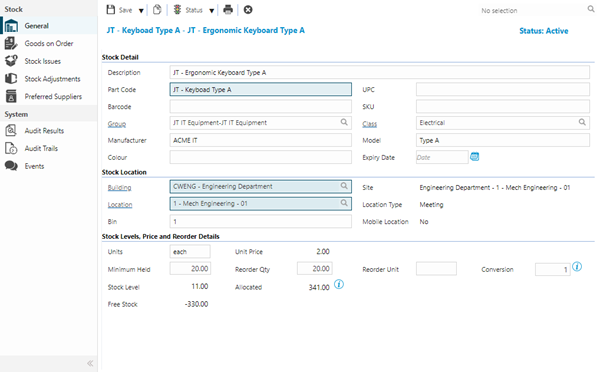 Each Item of Stock that is ordered for any Building can be recorded in the Stores Register. The Stores Register keeps track of the Locations of each Item and the quantity of that Item in that Location. It also keeps track of re-ordering information, such as the name of the manufacturer, the model type, bar code, quantity to be requested when an order is raised and the minimum level of Stock that can be reached before a new order is required.