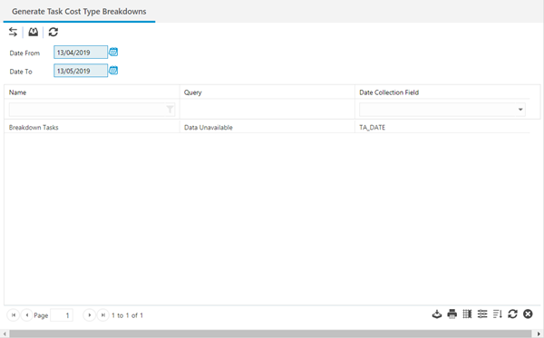 The link will open the Generate Task Cost Type Breakdowns grid. It is a grid view which can be searched, sorted and customised as normal.