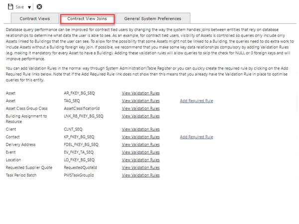 If possible, we recommend that you make some key data relationships compulsory by adding Validation Rules (e.g. making it mandatory for every Asset to have a Building). Adding these validation rules will allow queries to skip the check for NULL or 0 foreign keys and will improve performance. You can add Validation Rules in the normal way through System Administration\Table Register or you can quickly create the required rule by clicking on the Add Required Rule links below.