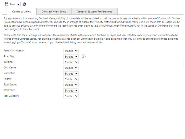 Note: These settings will not affect the availability of data within selected Contract pages and user interfaces where you expect user options to be filtered by the Contract Scope.
