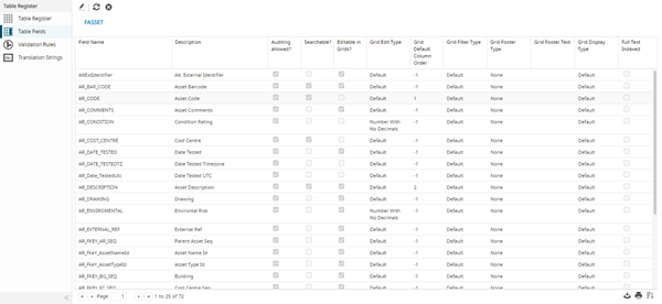 The link will open the Table Register / Table Fields grid. It is a grid view that can be customised and sorted as normal.